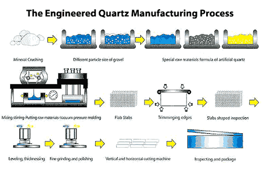 One of the reasons that Quartz is popular is that, being man made, it can be counted on to be more consistent in color and pattern from one piece to the next. Quartz countertops are formed by combining 90% ground quartz (a natural hard mineral) with 8-10% resins, polymers, and pigments. This forms a very hard granite-like surface. The appearance depends on how the quartz is ground: coarsely ground quartz produces a flecked appearance, while finely ground quartz produces a smooth look.